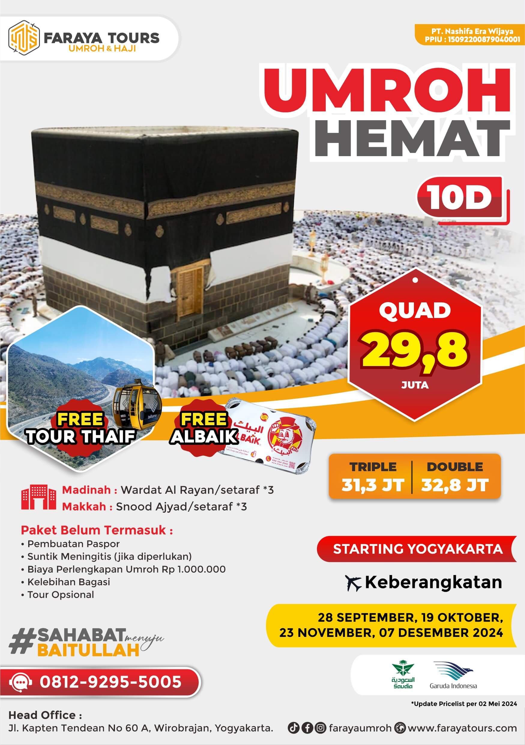 Dapatkan kemudahan dan kenyamanan dalam beribadah umrah dan haji sesuai dengan petunjuk Al-Qur’an dan As-Sunnah bersama Faraya tours.